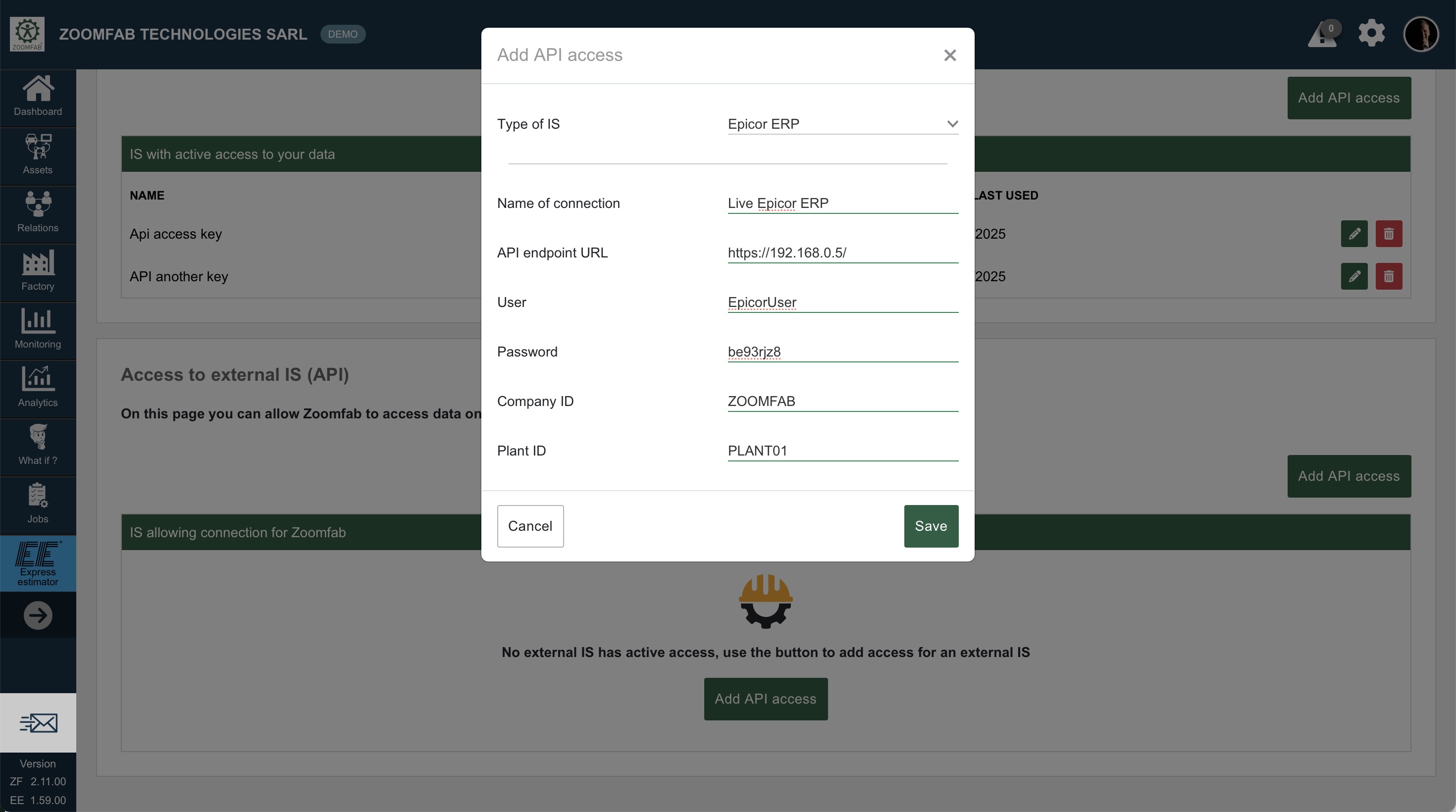 With this update, it is now possible to set up a connection to the Epicor ERP system. In the Settings page, under the External Information System section, you can add a new API access entry in the Access to External IS (API) group.