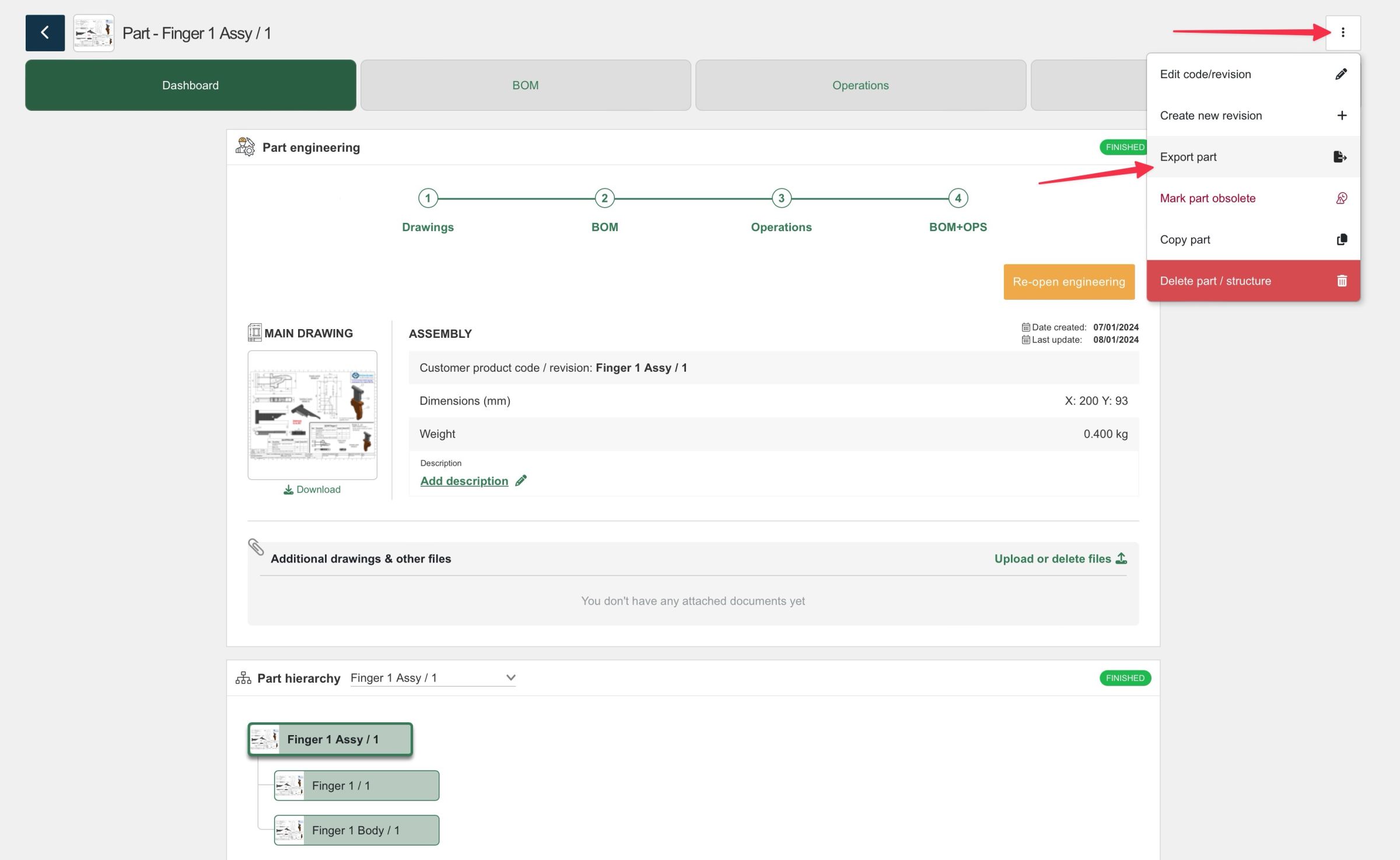 Export can be found on 2 places. In context menu of RFQ product or in context menu on part dashboard page.