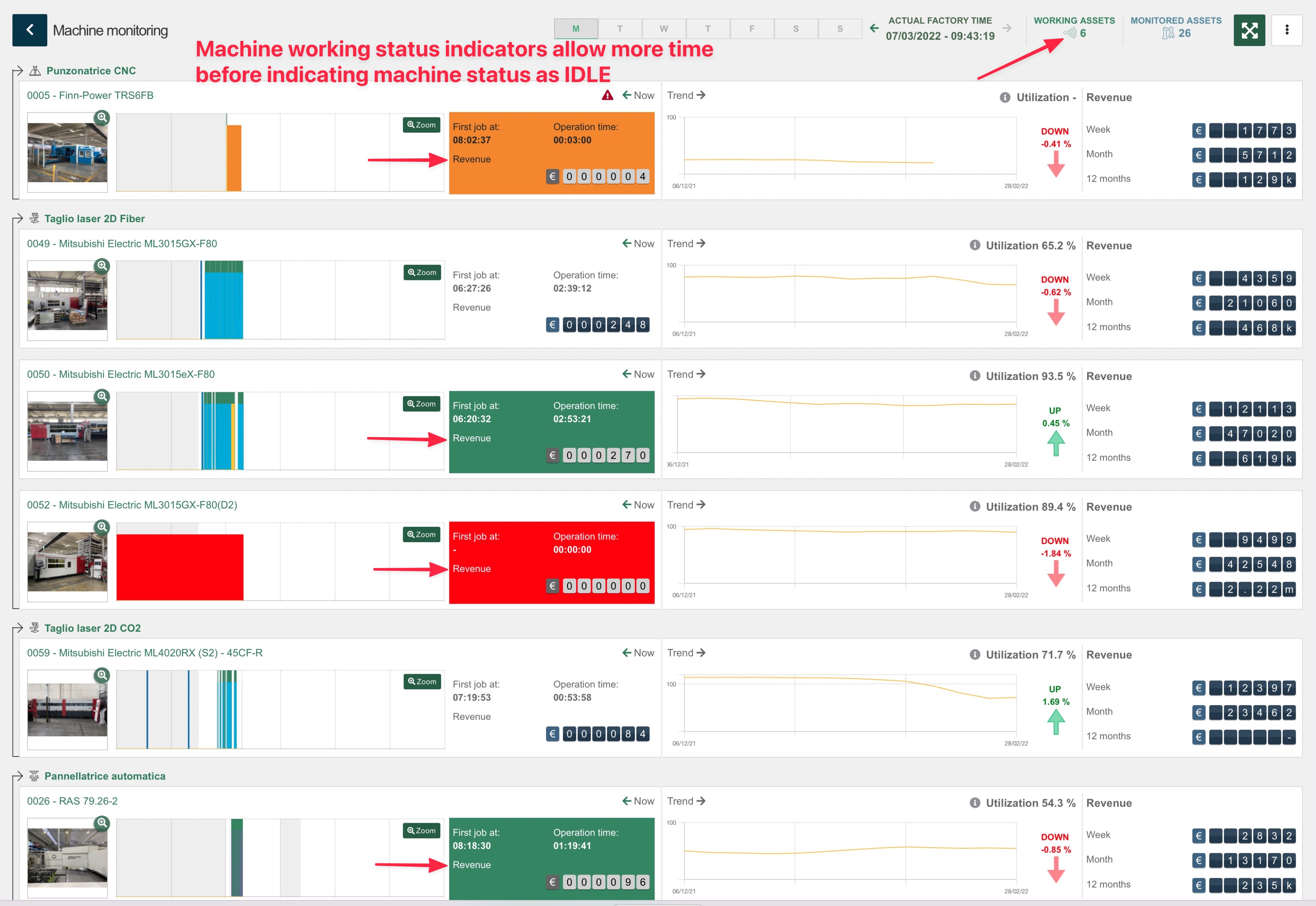 Machines work status indicators now allow for 3 minutes of machine idling before indicators show machine as idling. This allows for more manual handling during operators work between actual machine activity.